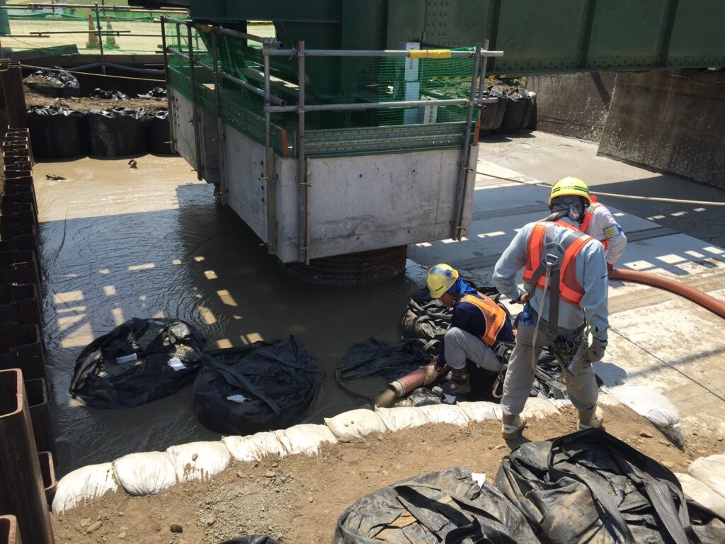 本工事では、鉄道橋脚部の耐震補強に伴い、埋戻し材として流動化処理土を使用しました。